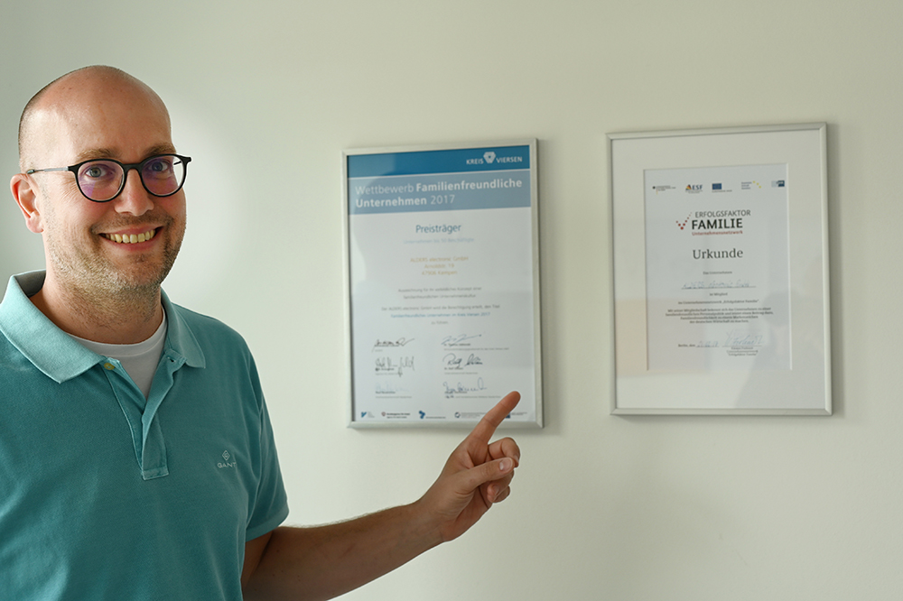 ALDERS electronic ist bereits mehrfach ausgezeichnet worden für seine familienfreundliche Unternehmenskultur. Kriterien wie flexible Arbeitszeiten, Betriebliches Gesundheits-Management, ergonomisches Mobiliar oder Dienstfahrrad werden beim Spezialisten für individuelle elektromechanische Bauteile individuell und mit Blick auf die Bedürfnisse der Belegschaft gelöst.