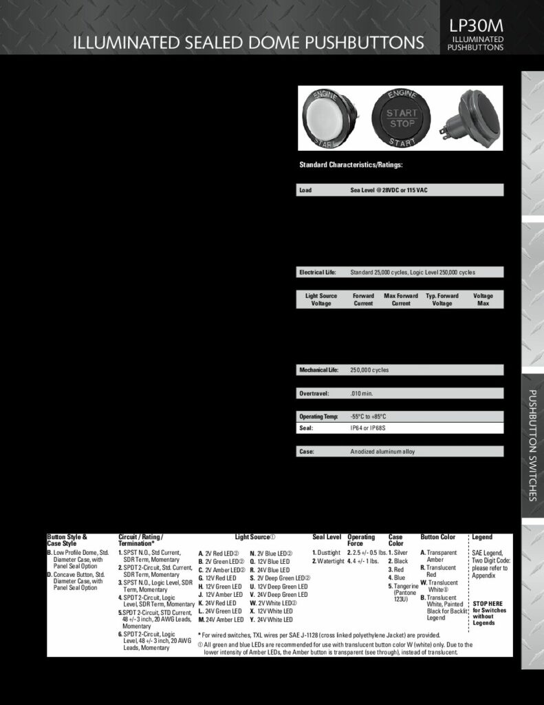 - Low-profile dome or concave-style button in translucent white, red or amber