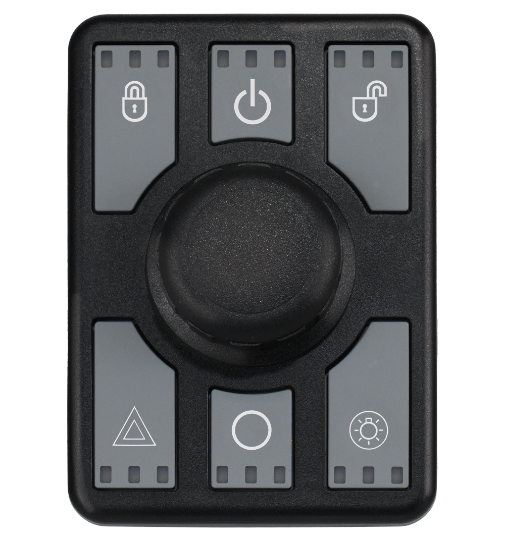 Chacun des six boutons est doté d’une LED de rétroéclairage blanche près du centre et de trois LED RVB en couleur sur le bord extérieur. Les LED RVB, qui clignotent de manière synchronisée ou individuellement, peuvent être réglées par des messages CAN. Le module clavier CAN standard est livré avec une configuration par défaut avec des paramètres de communication prédéfinis. Le module standard peut être immédiatement intégré à un réseau CAN client si le réseau est conçu pour accepter les paramètres par défaut.