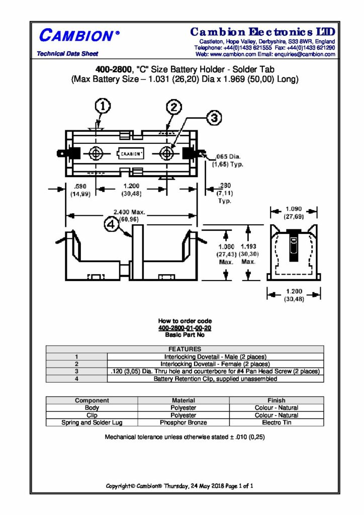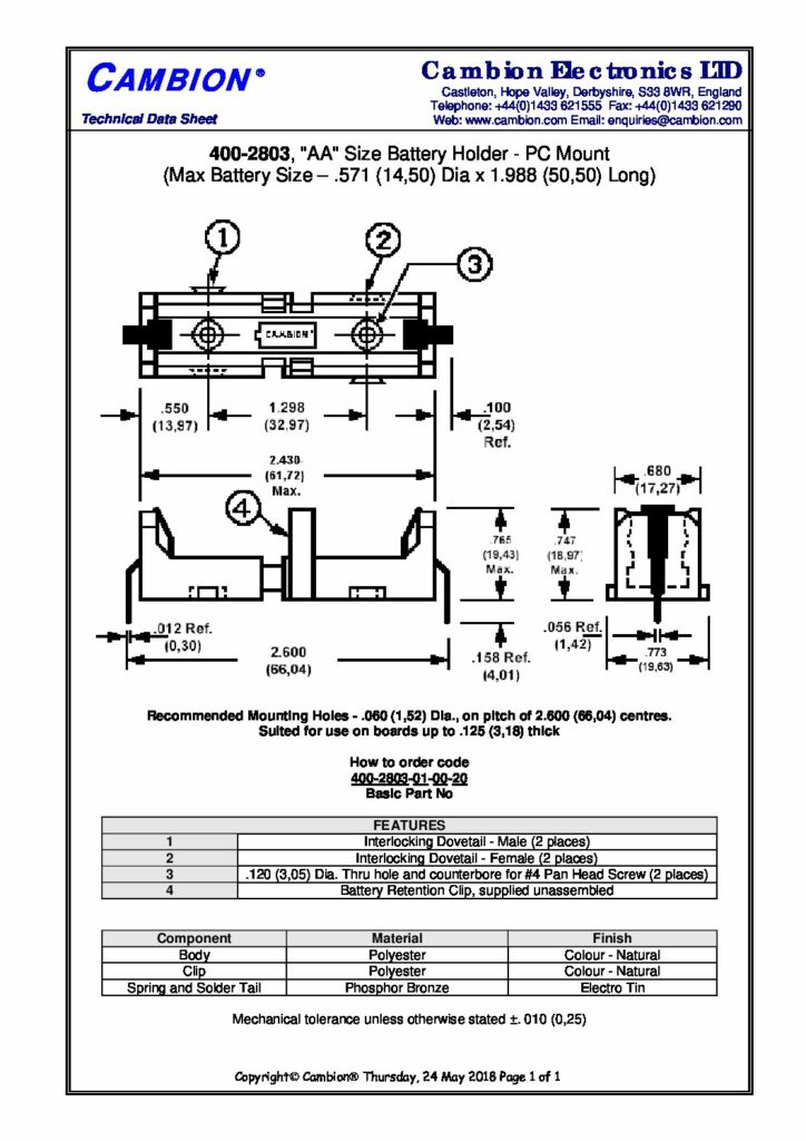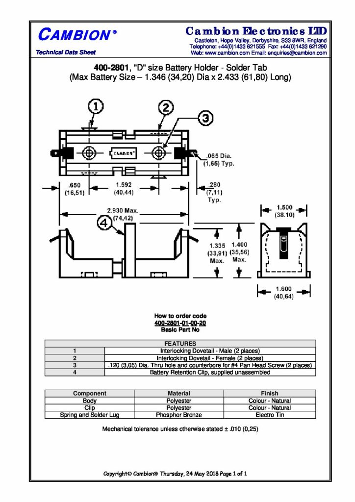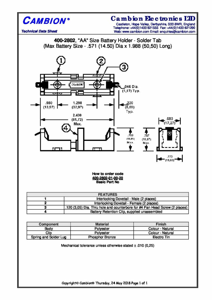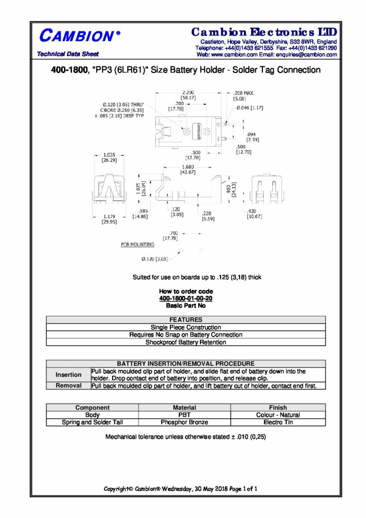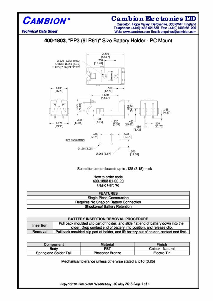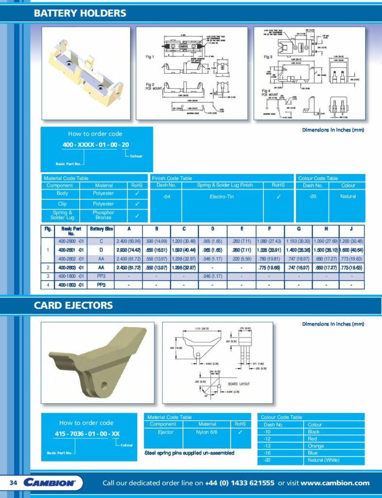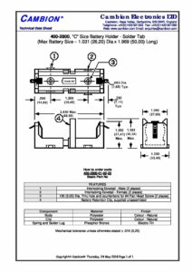| Hersteller | Cambion Electronics Limited | Kategorien | Battery holders (Batteriehalter) |