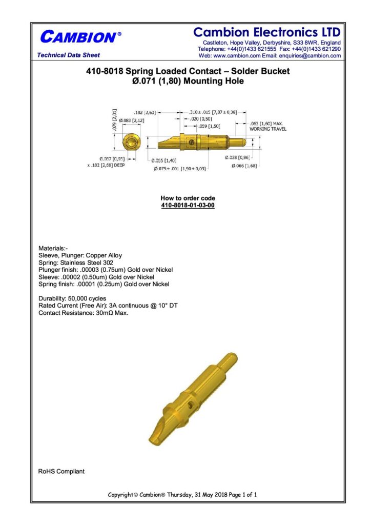 | Hersteller | Cambion Electronics Limited | Kategorien | Leiterplattenkomponenten, Spring loaded Contacts (Federgestützte Kontakte) |